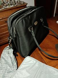 Borsa nera Avent in microfibra. Tre scomparti e varie tasche interne. Comprensiva di telo fasciatoio e sacchetto impermeabile. Tracolla. Unico neo, come da foto, una piccola spellata in un manico che però viene coperto con la chiusura a ganci.