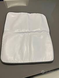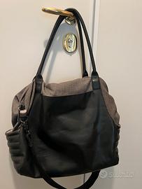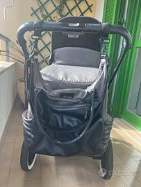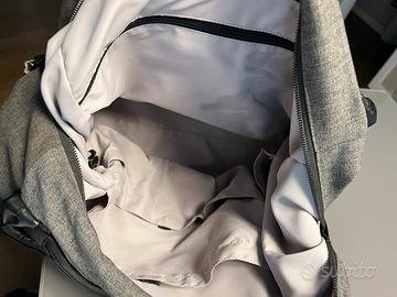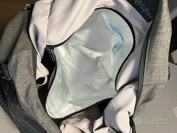 Borsa in pelle e in tessuto Cybex nella colorazione Grey Manhattan. All’interno si trova un piccolo tappetino per il cambio e ha una tasca refrigerata per poter tenere in fresco per un po latte e/o cibo.