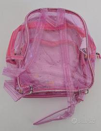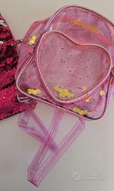 Vendo bellissimo set composto da una borsa a sacca e uno zainetto Girabrilla. Pari al nuovo. Dettaglio: - Borsa a sacca con paillettes reversibili rosa e argento. - Zainetto trasparente con dettagli a forma di cuore e paillettes interne.