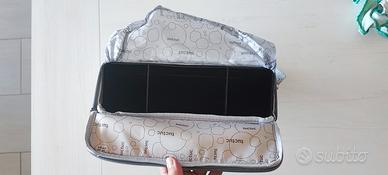 Comodissimo seggiolone alzasedia Tuc Tuc, ha una tracolla ragolabile, uno spazio interno di plastica rigida perfetto per riporre biberon, barattoli, piccoli termos, posate, bavaglini ecc.