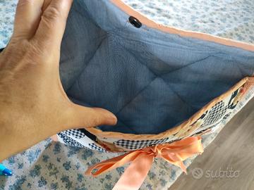pratica borsa in cotone con fiocco e bottone automatico leggermente trapuntata per portare pannolini e salviettine al cambio del bimbo