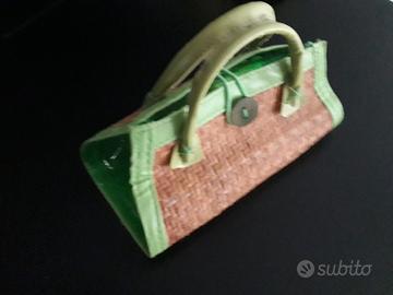 Borsetta bimba, in paglia profilata con bordino in similpelle verde, con facile chiusura di un elastico da agganciare su bottone di legno ,con due manici in similpelle verde ed interno foderato con plastica verde trasparente ,che lascia intravedere dai lati .Misura :larghezza cm 23, altezza cm 11, profondità cm 10. In omaggio ,abbinato alla borsetta un cappellino di misto cotone. Double face, taglia cm 58. Nuovi mai usati . Entrambi Euro 10