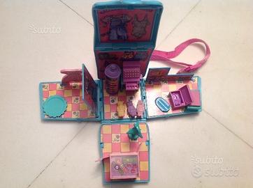 Piccola borsa di plastica di circa 20x20 cm, contiene 15 mobili della casa per ricreare camera da letto, salotto cucina e bagno più un omino snodabile. Zainetto apribile con spalline regolabili, diventa mini boutique con tre personaggi (coniglio, gatto, orso). Vendo anche separatamente. Il prezzo non comprende le spese per un'eventuale spedizione.