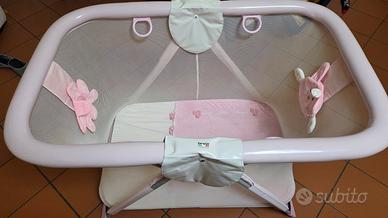 Box rettangolare per Bambini marca Brevi completo di morbido materassino sfoderabile e labile, 4 maniglie interne, 2 giochini in peluche ai lati.