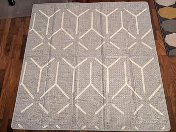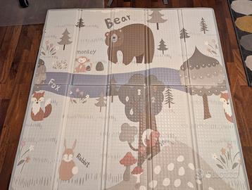 Comodo box basso 120x120 di colore beige. È dotato di due maniglie per fare aggrappare il bambino, di una comoda porticina per entrare ed uscire in autonomia e di un morbido tappeto con doppia fantasia. Tenuto molto bene