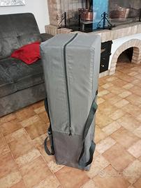 Totalmente richiudibile; base composta da tappeto rigido imbottito; dotato di rotelle per essere orientato all'interno della stanza; solido, telaio in metallo e tela; sacco per trasporto a cerniera con maniglie.