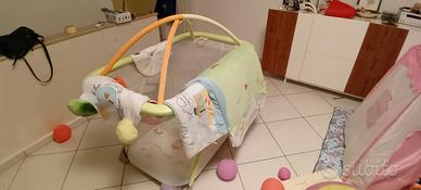 Box con tappeto estraibile, cuscino a forma di casetta ed archi per effetto giostrina, tutto in buonissime condizioni