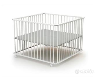 Box bambini pieghevole legno Bianco - 100 x 100 cm quasi mai usato, solo un paio di mesi da neonata, Realizzato in legno massello di faggio, è dotato di 4 ruote con freno e fondo in PVC