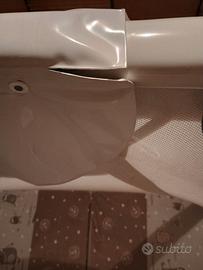 Box bimbi in buone condizioni ed una bellissima grafica sui toni del beige, rete e maniglie intatte e qualche piccolo difetto come riportato in foto (coprigiunto leggermente strappato, un segnetto rosso sul poggiamani ed un giunto alla base sostituito con un pezzo uguale stampato in 3D)