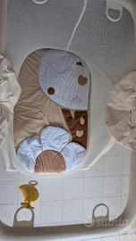 Spazio sicuro per gioco e relax con protezioni imbottite, rete anti-intrappolamento e tappeto lavabile. usato una volta.