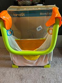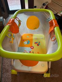 Box rettangolare che si apre e si chiude a compasso in un unico movimento, completo di pupazzi e con soffice tappeto asportabile e completamente sfoderabile per lavarlo in lavatrice.