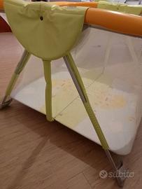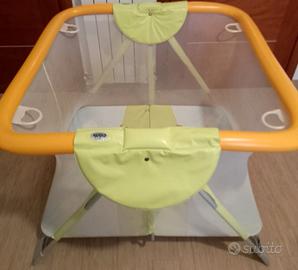 Box vissuto ma ancora efficiente. Semplice chiusura compatta. 4 maniglie per agevolare il bebè nei movimenti. PVC lavabile. Maglie DIN. Corrimano molto imbottiti. Dimensioni: aperto: cm. 110 x 118 x 75; chiuso: cm. 118 x 75 x 110. Peso: 14,2 Kg. Adatto 6-24 mesi.