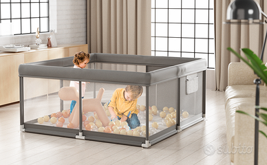 Vendo box per bambini con tappetino incluso, pratico, sicuro e ideale per creare uno spazio gioco dedicato e protetto. Il box misura 120x120x65 cm ed è perfetto anche per appartamenti o salotti non molto grandi. Grazie al design compatto e leggero può essere facilmente spostato in qualsiasi angolo della casa. Le ventose sul fondo assicurano massima stabilità su qualsiasi tipo di pavimento (laminato, piastrelle, parquet), impedendo che il bambino possa spingerlo o spostarlo. Incluso nel prezzo un tappetino su misura (120x120x1 cm), reversibile, impermeabile e lavabile. Garantisce un’area di gioco sempre asciutta e confortevole: macchie di latte, frutta o altri residui possono essere pulite facilmente con una salvietta senza dover lavare l’intero telo del box. Il box è realizzato con materiali sicuri e certificati CE, completamente atossici. La struttura utilizza tessuto Oxford 210D di alta qualità, resistente e traspirante. La copertura superiore, imbottita in spugna, è morbida e svolge una funzione ammortizzante, proteggendo il bambino da urti durante il gioco. Le pareti sono in rete traspirante che permettono ai genitori di vedere sempre i movimenti del bambino, garantendo sicurezza e tranquillità. Anche i piccoli si sentono rassicurati perché possono vedere i genitori. L’altezza di 65 cm è ideale per la sicurezza e per favorire lo sviluppo motorio. Il box dispone inoltre di una porticina con cerniera esterna, facile da aprire per i genitori ma non accessibile dall’interno al bambino. Inclusi anche due anelli di supporto, utili per aiutare il bambino a sollevarsi in piedi e fare i primi tentativi di movimento. Il montaggio e lo smontaggio sono semplici e veloci, non servono strumenti particolari e in pochi minuti il box è pronto per l’uso. Una soluzione pratica e sicura per offrire al bambino uno spazio personale di gioco e movimento, dando serenità e comodità a tutta la famiglia.