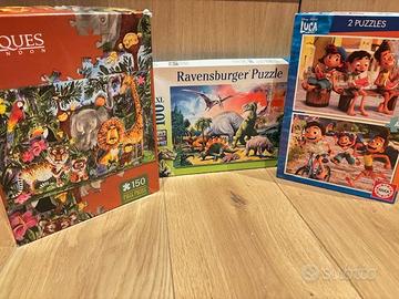 Box contenente: 1 puzzle Ravensburger animali preistorici 100 pezzi 6+; 1 puzzle Jaques London Forest Animals 150 pezzi 3+; 1 puzzle Luca 48 pezzi; Il mio primo Scarabeo; Go Go English di Lisciani; Kids Design 4-7 anni; Wooden Train Set - Tiny Land 39 pezzi; pannello luminoso a Led A4 Alecto per scrivere messaggi