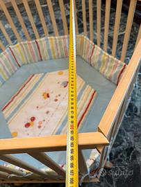Box evolutivo ed esagonale in legno dotato di barre piatte e di un materassino imbottito.