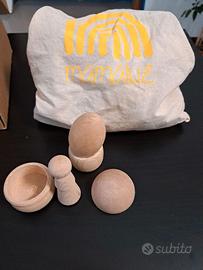 🔹 Sacco dei Tesori (Treasure Basket) – Un morbido sacchetto contenente oggetti in legno naturale di forme e dimensioni diverse, ideali per l’esplorazione tattile e visiva. Ogni elemento è studiato per essere sicuro e stimolante.