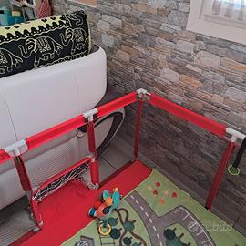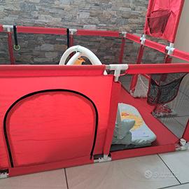 bellissimo, spazioso e moderno box per gioco bambini, completo di anelli per alzarsi, porte e canestro. 180x120 più 30 cm a lato per le porte da calcio con rete. adatto a più età. Se interessati, con 40 euro in più aggiungo palestrina CAM che vedete in foto anche lei completa e ben mantenuta e il tappeto.