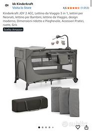 Lettino da viaggio che puo fungere anche da box per il momento del gioco. Questo modello include anche il fasciatoio, degli scomparti per riporre oggetti come pannolini e salviette e anche la giostrina come in foto. Il lettino puó adattarsi sin dai primi mesi perchè puo essere alzato il materasso.