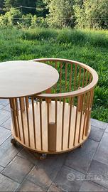 Box per bambino, a due piani per seguire la sua crescita, su ruote piroettanti, in legno masello verniciatura naturale, smontabile in caso di trasporto