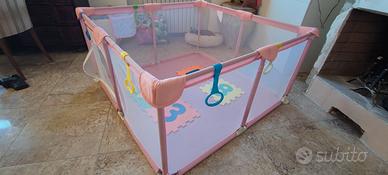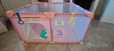 Box bambini 124x 124 x 63cm come nuovo. IN REGALO 25 piastrelle gomma 32x32cm come sottofondo . I bambini che iniziano a gattonare sono protetti da cavi e prese o piccole parti. inclusi 2 sostegni colorati per box. L'altezza scientifica e sicura di 63 cm rende la visuale del bambino libera. ha porte con cerniera per un facile utilizzo. La cerniera è all'esterno in modo che il bambino non possa aprirla da solo, il che aumenta la sicurezza e consente al bambino di giocare liberamente.