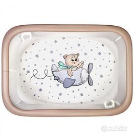 Corrimano e fondo ben imbottiti, materiale plastico atossico lavabile, fitta rete protettiva a norme di sicurezza, quattro ganci bloccanti una volta aperti.