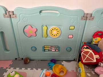 Box recinto pieghevole in plastica con porta con doppia chiusura esterna e pannello giochi Dimensioni 146x 146x64 tot 14 pannelli (io ne ho usati solo 12 per motivi di spazio ma ho i 2 da parte) Utilissimo per neonati e bimbi piccoli
