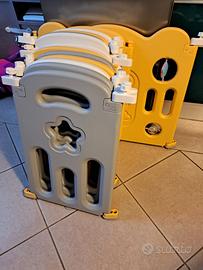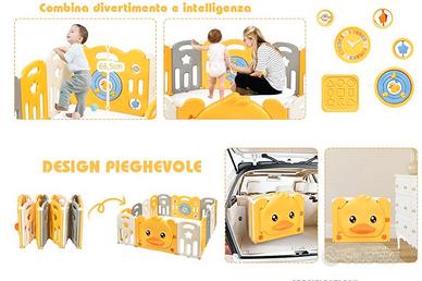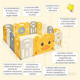 COSTWAY Box Recinto per Bambini da Giocare, Pieghevole con 14 Pannelli, con Porta e Giochi Multipli (160 x 169 x 67 cm) HDPE come materiale atossico e senza BPA. Alta stabilità: cuscinetti antiscivolo e le ventose nella parte inferiore mantengono fermi i pannelli. Pannello con giochi: ci sono le palline girevoli e le stelline sonore sul pannello giocattolo che esercitano le abilità cognitive e motorie del bambino. Per facilitare il montaggio, il pannello con il cancello è pieghevole, il box si sposta facilmente ovunque non occupa molto spazio e si può riporre in un angolo. Si può montare in forma circolare, rettangolare, quadrata e anche con forme irregolari. • I bambini imparano a gattonare, a camminare e a sviluppare la motricità in un posto sicuro e spazioso. • Il pannello con giochi stimola l’immaginazione del bambino ma anche le abilità cognitive • Realizzato in HDPE atossico e senza BPA, garantisce la salute del bambino Cuscinetti antiscivolo in gomma per garantire la stabilità del box Ventose antiscivolo per mantenere fermi i pannelli Chiusura di sicurezza sulla porta per evitare che il bambino la apra Pannelli combinabili nella forma che si preferisce Ampio spazio per far giocare i bambini Facile da montare, smontare e spostare Colore: giallo e bianco Dimensione prodotto: 160 x 169 x 67 cm Dimensione pannello porta: 80 x 67 cm Dimensione pannello con giochi: 80 x 67 cm Dimensione pannello piccolo: 39 x 62 cm Peso prodotto: 13,6 kg Abbiamo scelto questo grande box perché ci piaceva moltissimo, ed è stato un ottimo acquisto: la nostra bimba ha imparato a gattonare e camminare in sicurezza supportandosi dai vari pannelli, inoltre passava il tempo a giocare divertendosi tanto. E’ in condizioni eccellenti, come nuovo. Ritiro a mano a Vigonza. Pagato 198€ lo vendiamo a 98€, prezzo non trattabile.