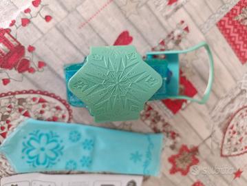 Bracciale Frozen magico ghiaccio, con manicotto in tessuto disegnato e bomboletta per l'acqua. Sì possono spruzzare le bombolette di schiuma per simulare la neve e le bombolette di stelle filanti. Accessori perfetto per il vestito di carnevale di Frozen ma anche da utilizzare come gioco tutto l'anno