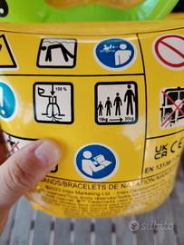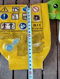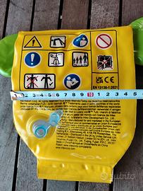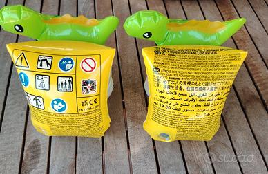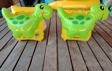 Braccioli gonfiabili Intex a forma di dinosauro, perfetti per i più piccoli. Sono due braccioli, colorati e in ottime condizioni. Ideali per imparare a nuotare in sicurezza e divertimento! - Marca: Intex - Motivo: Dinosauri - Colore: Verde e Giallo.