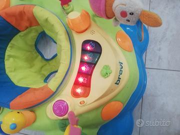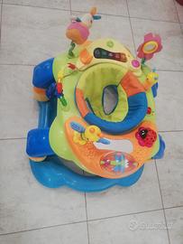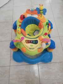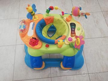 Superleggero con bordo antiurto e 6 pattini di sicurezza antiscivolo, è una vera palestra interattiva, grazie ai 14 simpatici giochini per stimolare il bambino. Ha seggiolino che ruota di 360° e sistema di regolazione a 3 altezze. L'imbottitura del seggiolino è lavabile in lavatrice. Il centro gioco funziona con 2 pile formato stilo (non incluse)