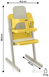 Completo di tutti i suoi elementi di serie: poggiapiedi regolabile e rimovibile, con vaschetta asportabile raccoglibriciole; bordo rigido di contenimento e bretelle/cintura di sicurezza (non raffigurati in foto).