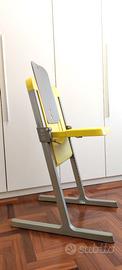 "Seggiolone con regolazione continua della seduta in altezza, in 4 posizioni in profondità e con poggiapiedi regolabile in 21 posizioni, per adattarsi alla crescita del bambino assicurando sempre una seduta corretta, comoda ed ergonomica con i piedi ben appoggiati, i gomiti allo stesso livello del piano del tavolo e una corretta postura di collo, spalle e schiena.