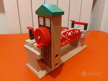 Il ponte levatoio è un'interessante aggiunta a qualsiasi set ferroviario in legno. Al ponte si accede tramite due binari di avvicinamento che terminano con delle barriere. A un'estremità si trova una torretta di legno a cui è attaccata una bobina collegata al ponte. Ruotando da un lato o dall'altro, il ponte può essere sollevato e abbassato. Tutti i binari Brio e gli elementi aggiuntivi sono adatti all'espansione del sistema e sono compatibili anche con i binari in legno di altri produttori. Altri set venduti separatamente.
