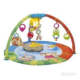 Tappeto morbido imbottito, dai disegni divertenti, con un morbido cuscino a forma di riccio. Il pannello elettronico interagisce con il bambino tramite effetti luminosi multicolore, suoni e musiche. Puoi collegarlo al tuo lettore MP3 per personalizzare la musica.