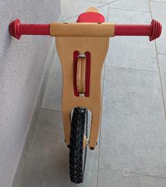 Bicicletta in legno, fattura artigianale, senza pedali, con pneumatici nuovi gonfiabili.