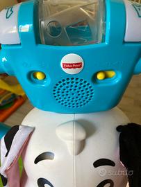 Vendo bellissimo Cagnolino Saltellante e Girevole della Fisher-Price, il compagno di giochi ideale per i primi passi e lo sviluppo motorio dei più piccoli. Il bambino può saltellare su e giù e ruotare completamente, stimolando l'equilibrio e la coordinazione. Dotato di pulsanti luminosi e un rullo musicale che insegnano l’alfabeto (ABC), i numeri (123), i colori e le forme (funziona con 3 batterie stilo non fornite). La pedana verde è ampia e sicura, progettata per garantire la massima stabilità sul pavimento. Maniglie facili da afferrare per far sentire il bambino sicuro mentre gioca. Usato pochissimo, in ottime condizioni (come da foto). Qualità garantita Fisher - Price. Ritiro solo a mano zona Pistoia/montagna pistoiese. NB: già montato e pronto per l’utilizzo; privo di scatola e istruzioni.