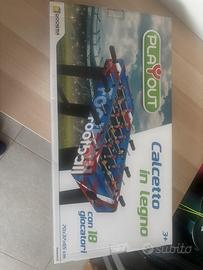 Vendo calcetto in legno nuovo, mai usato, causa doppio regalo.18 giocatori. Vedere bene misura del prodotto nelle foto.