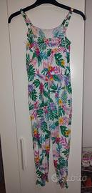 Tuta in cotone senza maniche, stampa floreale tropicale, laccetto in vita. Ruches sullo scollo frontale, arricciatura sul dorso. Elasticizzato alle caviglie. Tessuto molto fresco. Misura 5-6 anni. In perfette condizioni, tenuta con cura.