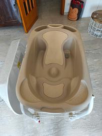 Morbido fasciatoio con sistema anti-ribaltamento, include vaschetta Baby Bagno dotata di portasapone e porta spugnetta, con 2 sedute anatomiche e antiscivolo (una inclinata per bimbi da 0 a 6 mesi e una seduta con braccioli per bimbi da 6 a 12 mesi) adatto fino a 11 kg.