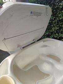 Fasciatoio imbottito reclinabile con vaschetta mobile dotata di tubo per scarico acqua facilitato.