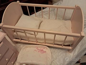 Vendo camera per Bambola Corolle composta da lettino con materasso e cuscino, cassettone tra cassetti e componenti per armadio. Tutto originale anni '80 e in perfette condizioni.