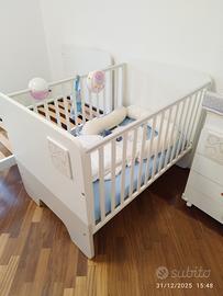 set doimo cityline per cameretta bambini composto da: fasciatoio con 4 cassetti e vaschetta per fare bagnetto sotto al fasciatoio; lettino con materasso con una sbarra fissa e una regolabile e facilmente removibile; letto da una piazza senza materasso con doghe in legno. vendibili anche separatamente