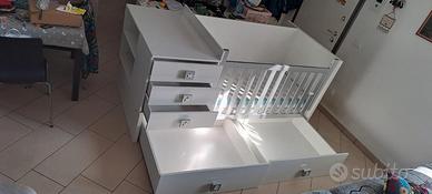 Cameretta trasformabile marca Alondra 70x140. Da lettino con sponda, tre cassetti e vano laterale portaoggetti si trasforma in una camera completa di letto, scrivania e cassetti. Per il bambino da 0/3 anni a 5+ anni.