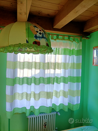 Scrivania con sedia e vari articoli abbinati, tipo paracolpi, tende, copripiumino, lampadario, tutto personalizzato da lavoro sartoriale.