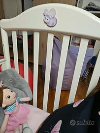 Cameretta completa per nuova nascita, armadio a due ante una parte con mensole e l'altra con appenderia; lettino con sponde; fasciatoio da tre cassetti. Marca Azur, legno bianco e lilla con Orsetto. Tenuta in modo impeccabile, ma con qualche logico segno d'usura.