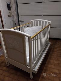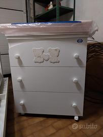 Cameretta Pali completa di lettino con spondina regolabile e cassetto , materasso, piumino a sacco , paracolpi e cassettiera fasciatoio con vaschetta interna .