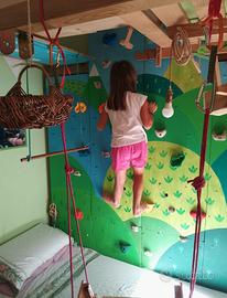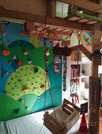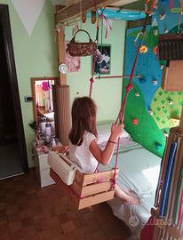Struttura autoprodotta totalmente in legno per il divertimento dei bambini (2-7 anni). Ideata per il divertimento/motricità di mia figlia si sviluppa sopra il suo letto composta da: rete con doghe in legno per letto singolo, predisposizione per parete d'arrampicata con appigli intercambiabili (ATTENZIONE: mancano le prese); casetta in legno con tunnell; altalena in legno asportabile; trapezio; scala di accesso sopra mobile ikea (non compreso) ; teleferica/cestino. Vendo causa inutilizzo e perchè mia figlia è diventata troppo grande. La struttura è smontabile e rimontabile in qualsiasi cameretta (area di ingombro 2 metri x 1,30 x 2,5h). Necessario sopralluogo prima della vendita. Non spedisco ma posso dare una mano a smontare/trasportare