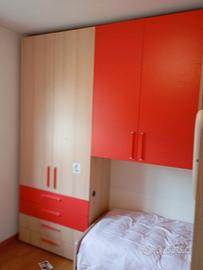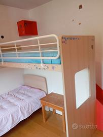 Simpatica, robusta, furba. I letti sono a castello , ma perpendicolari, creando lo spazio sotto raccolto e arioso allo stesso tempo. Il letto sopra si raggiunge da robuste scalette di legno, che sono anche vani portaoggetti spaziosi e comodissimi. Armadio a ponte di ottima fattura con 4 ampi cassetti. Inclusa nel prezzo doppia scrivania con tavolo estraibile che ruota a fino a 180gradi con cassettiera.