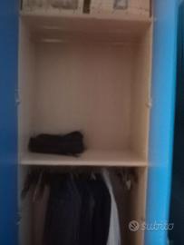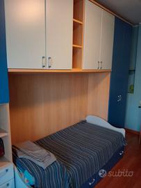 Camera completa di letto e materasso di colore azzurro e blu cobalto con maniglie per aprire caretti e armadio incolore opposto cioè azzurro/blu cobalto e blu cobalto/azzurro ci sono due cassetti contenitore sotto al letto