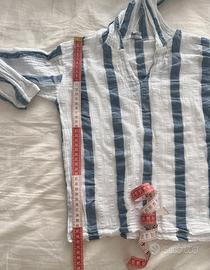 Bellissima camicia estiva a righe bianche e azzurre, realizzata artigianalmente in Grecia. Fresca, leggera e traspirante, perfetta per l’estate, il mare o look casual eleganti.